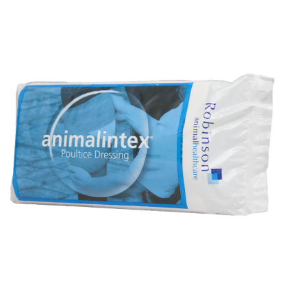 All purpose veterinary poultice and wound dressing that can be cut to size for use on horses and dogs. Unique combination of Boric acid (promotes effective healing) and Tragacanth (natural poulticing agent) in a dressing with low adherent skin contact layer, cotton wool absorptive layer, cushioned protective layer and plastic backing. Can be used as a hot or cold wet poultice, or as a dry dressing. Treats infected and open wounds, abscesses, cracked heals, mud fever, puncture wounds, laminitis, thrush, seedy toe, capped hocks and elbows, splints, sore shins and relieves sprains.